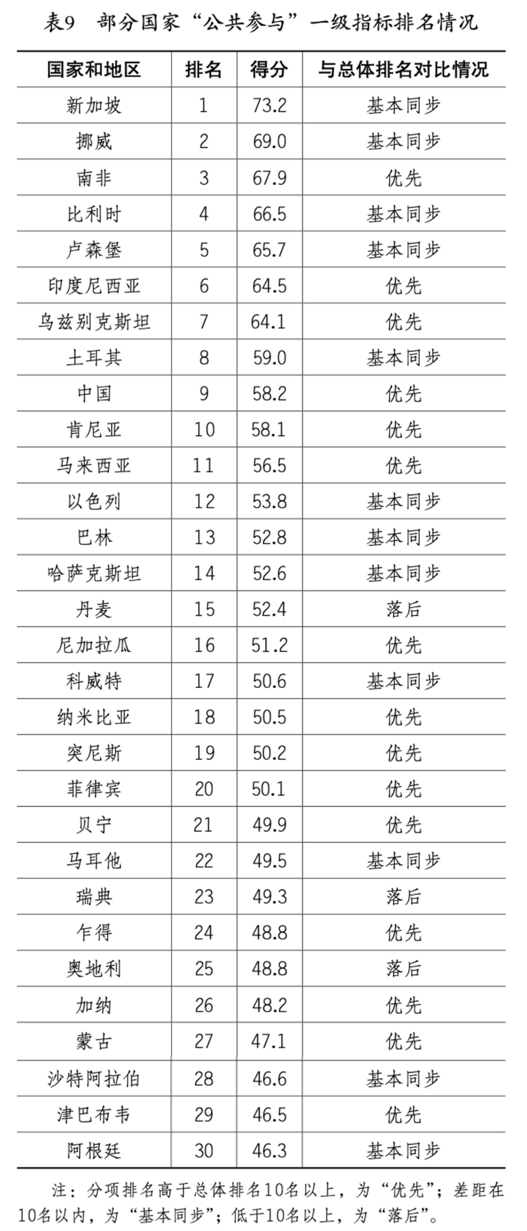从排名情况看,前30名国家中,有27个国家的排名优先于总体排名或基本持平。值得关注的是,部分总体排名较低的国家(如乍得、印度、贝宁、尼日尔等)在此领域排名大幅领先,且前10名中仅有1个欧洲国家(罗马尼亚)、1个发达国家(新加坡),这说明家庭婚姻幸福、社会安全与地域分布、经济社会发展水平等因素并无必然关联。如果一个国家在经济快速发展的同时忽视青年在婚姻家庭、社会安全等领域的发展诉求,青年整体发展水平也将受到较大制约。 (五)公共参与 公共事务受到各国青年普遍关注,社会参与是青年不可或缺的成长途径。在“公共参与”一级指标中,课题组设计组织参与活跃度、40岁以下青年民意代表比率、民意代表选举投票率等3个二级指标,具体评分排名结果如下: