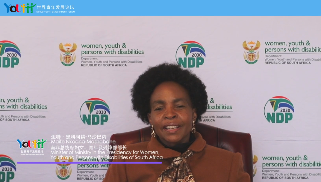 南非总统府妇女、青年及残障部部长迈特·恩科阿纳-马沙巴内在世界青年发展论坛上致辞